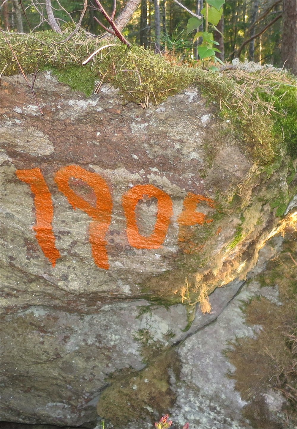 Der tar vi av et tråkk mot høyre, og deretter en sving til venstre gjennom lyngen og frem til 1905-steinen. Den er ikke helt enkel å finne, men kikk på kartet, så kanskje du klarer det?